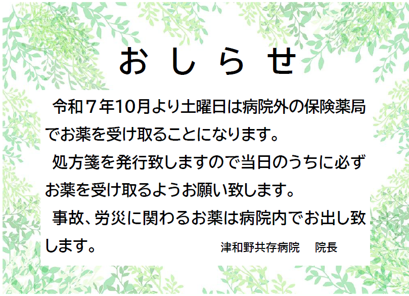 R7.10月~土曜日の受診時 院外処方対応へ